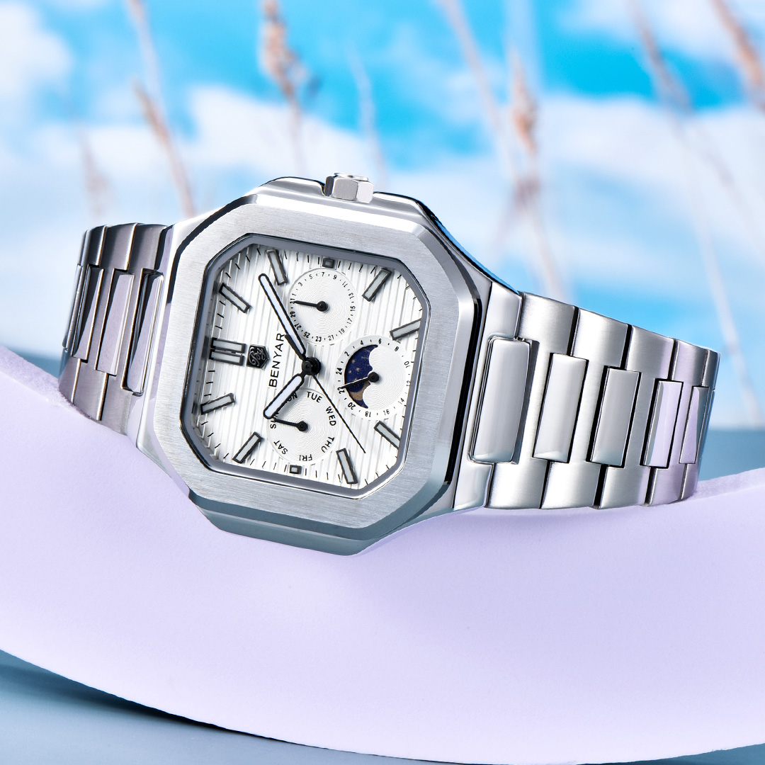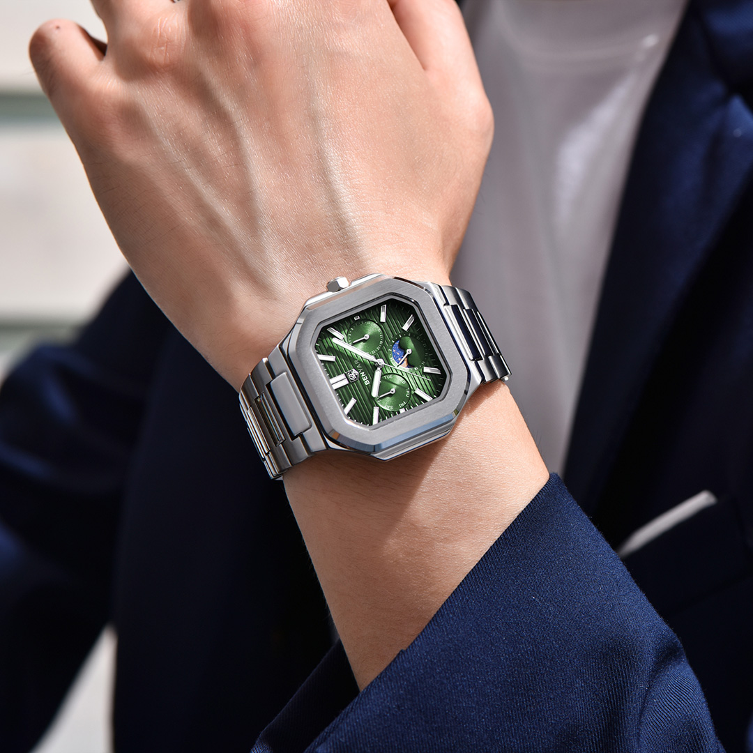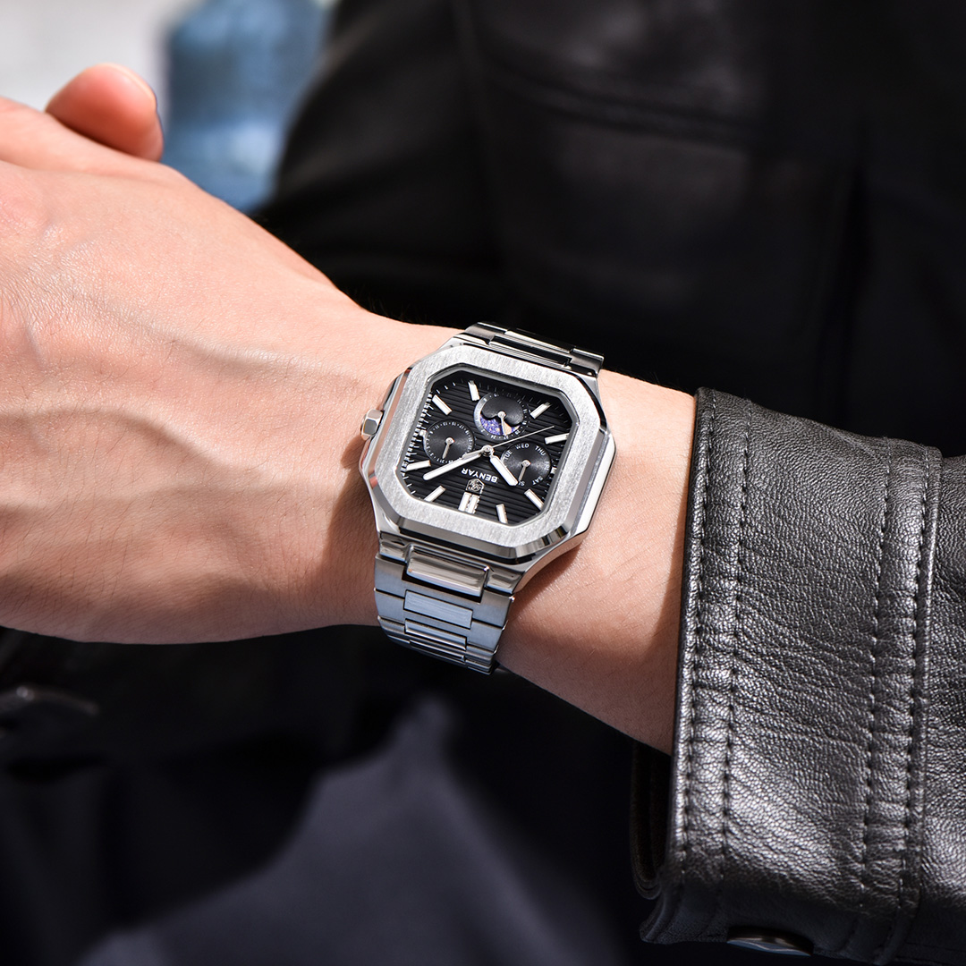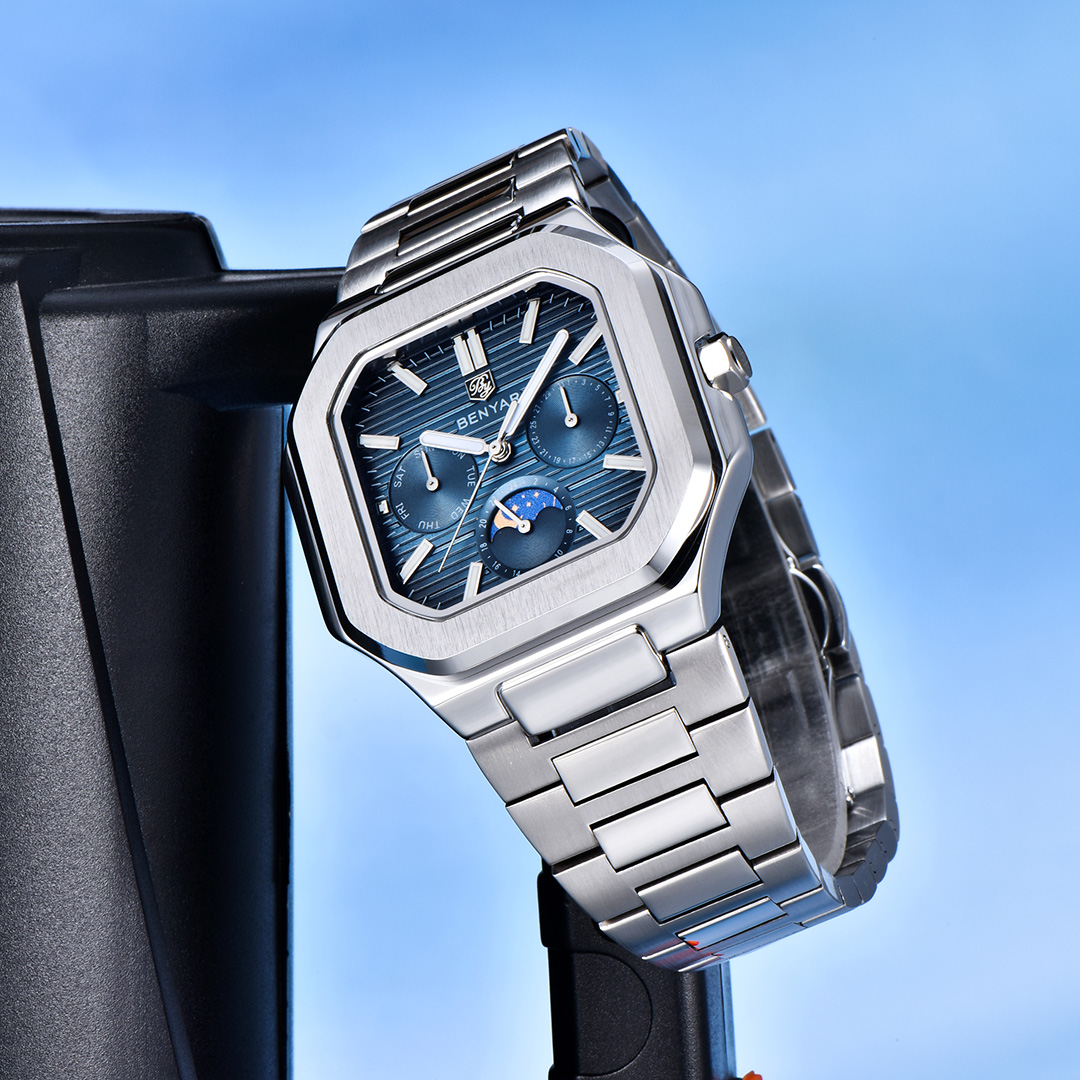 BENYAR BY-5221 Quartz Men's Watch Stainless Steel Square Sports Wrist Watch for Men, Moonphase, Week Date Display