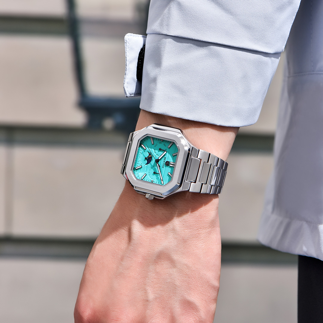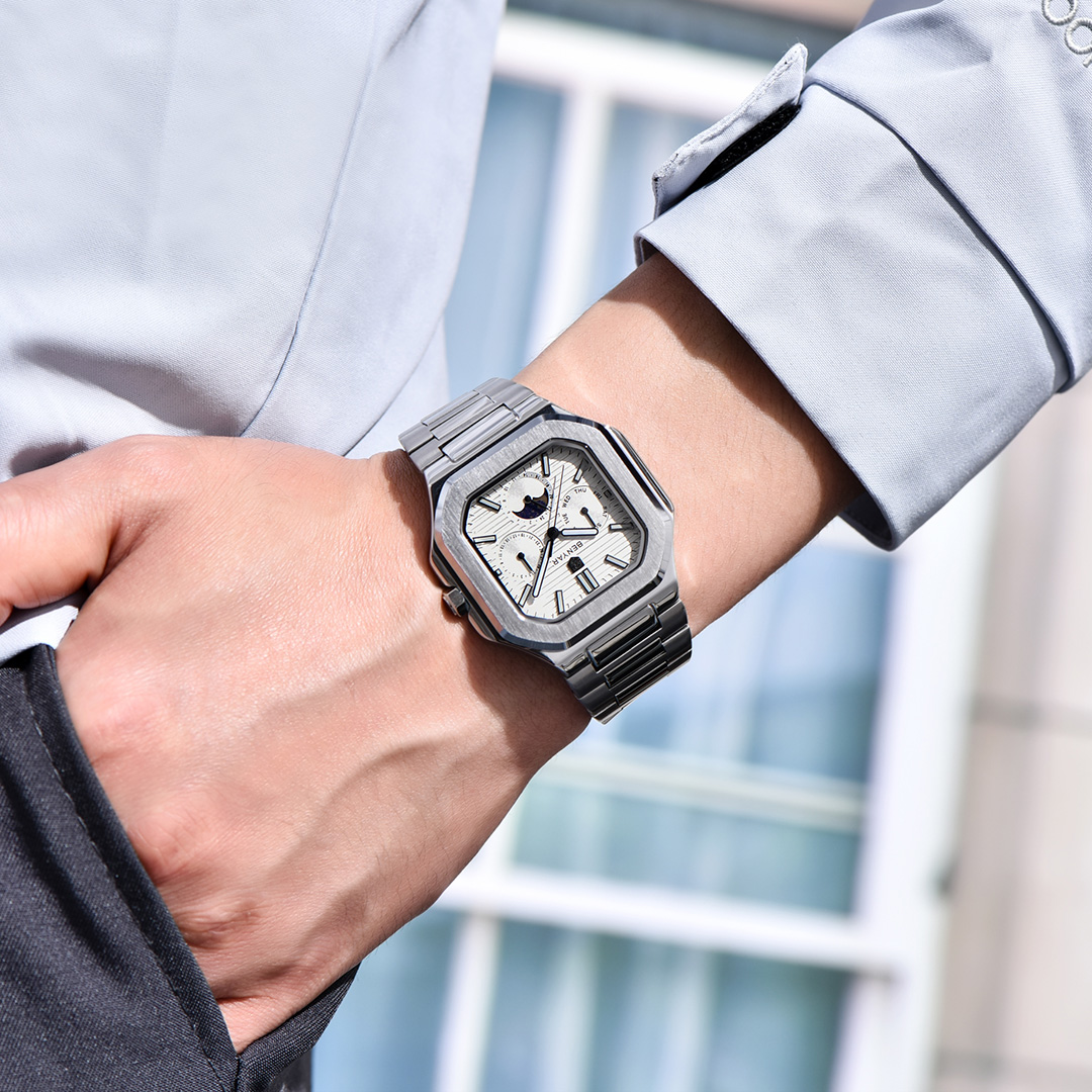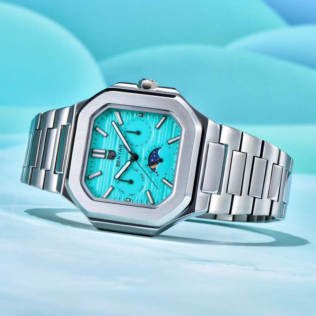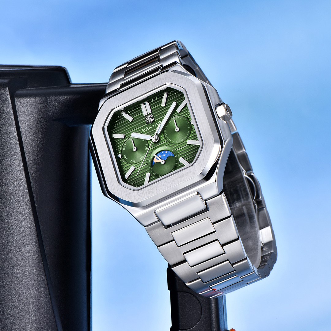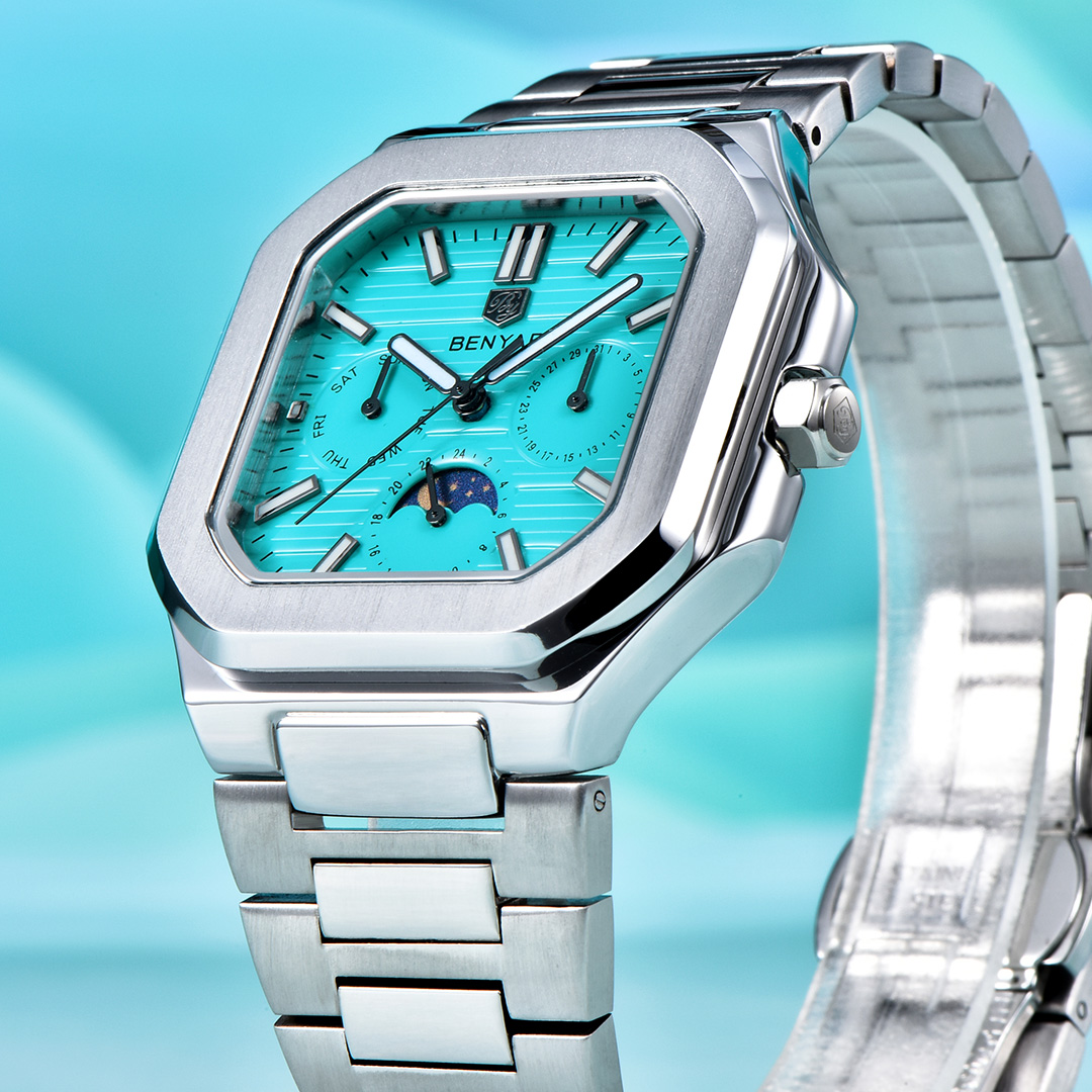 BENYAR BY-5221 Quartz Men's Watch Stainless Steel Square Sports Wrist Watch for Men, Moonphase, Week Date Display