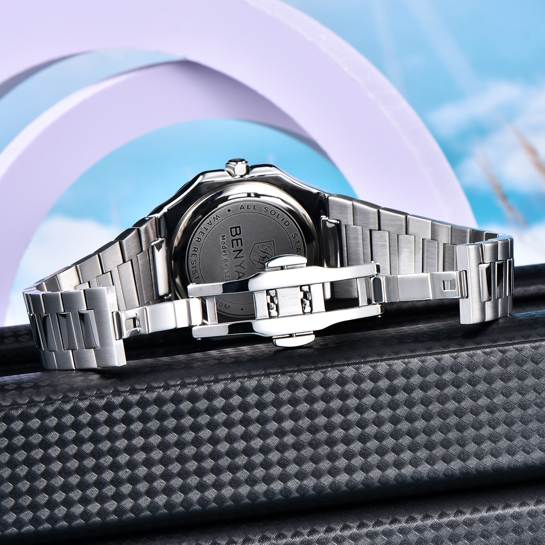 Material: Full stainless steel construction, Hardlex dial glass, Solid Case Back, and reliable PE806 quartz movement